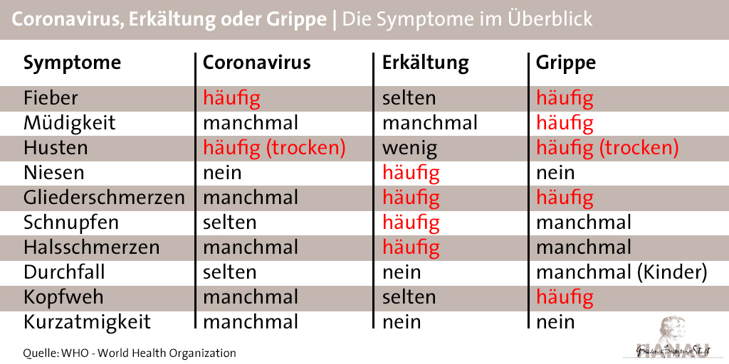Welche Krankheitszeichen werden durch das neuartige Coronavirus ausgelöst und wie unterscheidet es sich von einer normalen Erkältung / Grippe?